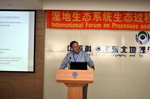 7月29日上午進行了會議開幕式和大會學(xué)術(shù)報告。開幕式由中國科學(xué)院濕地生態(tài)與環(huán)境重點實驗室呂憲國主任主持,我所劉興土院士、何興元所長分別致辭。中國科學(xué)院濕地研究中心副主任劉興土院士簡要介紹了當(dāng)前濕地學(xué)科的進展和存在的關(guān)鍵科學(xué)問題,并對于濕地學(xué)科寄予了美好的期望,希望借此次國際會議,世界各地的科技工作者充分交流,共同為保護濕地、利用濕地做出應(yīng)有的貢獻。何興元所長代表我所對所有參會人員的到來表示歡迎,希望借本次會議增進濕地學(xué)科的國際合作與交流,他還簡要介紹了我所的基本情況及我所濕地學(xué)科的人員情況、科研成果及發(fā)展?fàn)顩r等。應(yīng)會議邀請,國家林業(yè)局濕地保護管理中心馬廣仁主任、吉林省林業(yè)廳喬恒副廳長、劉興土院士、路易斯安那州立大學(xué)海岸環(huán)境學(xué)院Christopher F D'Elia院長分別以“濕地生態(tài)系統(tǒng)保護管理”“吉林省濕地保護與資源綜合利用”“退化濕地恢復(fù)—葦蟹(魚)稻生態(tài)恢復(fù)工程”“路易斯安那州濕地科學(xué)與教育”為題作了大會主題報告。