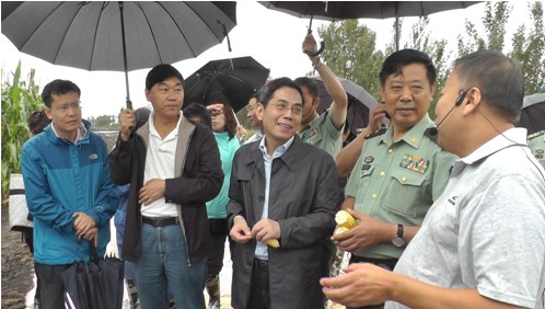 2013年8月22日,中國科學院副院長施爾畏,沈陽軍區(qū)聯(lián)勤部副部長王江等領導冒雨來到沈陽軍區(qū)老萊農副業(yè)基地和雙山農副業(yè)基地,視察了由中國科學院與沈陽軍區(qū)聯(lián)合實施的 “現(xiàn)代農業(yè)示范項目”。領導們聽取了相關項目負責人的現(xiàn)場匯報,并與科研人員進行親切交流,詳細了解項目的進展與示范推廣情況。