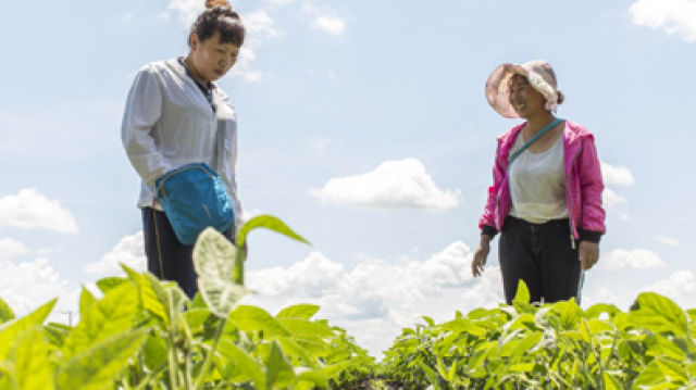 李艷華在農(nóng)民王淑艷的地里查看大豆長(zhǎng)勢(shì)。(新華社記者劉宇軒攝,2018年6月27日)