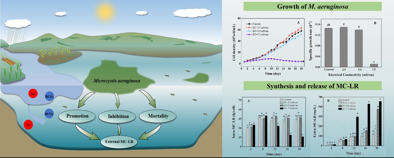 銅綠微囊藻(M.aeruginosa)是引起藍藻水華的優(yōu)勢藻種之一,其產生的微囊藻毒素(microcystins, MCs)嚴重威脅水生生物和人體健康。隨著鹽堿化地區(qū)土地資源的大規(guī)模開發(fā)利用,大量農田退水和水產養(yǎng)殖廢水的排放將導致地表水體堿性鹽含量升高,對水體中銅綠微囊藻的生長和產毒過程可能會產生影響。但目前這方面的定量化研究還鮮有報道,其內在的影響機制也不清楚。為此,東北地理所科研人員開展了鹽堿脅迫對銅綠微囊藻生長和產毒影響及機制的系統(tǒng)性研究,以期揭示不同強度堿性鹽脅迫對銅綠微囊藻生長、生理和細胞超微結構的影響,量化胞內外微囊藻毒素LR(MC-LR)的含量變化,闡明銅綠微囊藻對堿性鹽脅迫的響應機制。