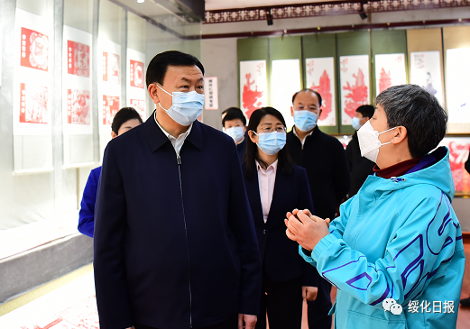 在海倫市剪紙展館,張寶偉與國(guó)家級(jí)非物質(zhì)文化遺產(chǎn)海倫剪紙藝術(shù)傳承人交流,詳細(xì)了解海倫剪紙發(fā)展歷程。他強(qiáng)調(diào),要挖掘好、宣傳好、傳承好海倫剪紙文化,堅(jiān)定不移走好傳承與發(fā)展之路,增強(qiáng)文化底蘊(yùn),不斷創(chuàng)新形式,堅(jiān)持以歌頌黨、歌頌祖國(guó)、歌頌人民幸福生活為根本,創(chuàng)作出更多的藝術(shù)佳作,把海倫剪紙的特色文化品牌持續(xù)叫響。要用好省、市發(fā)展創(chuàng)意設(shè)計(jì)產(chǎn)業(yè)的扶持政策,大力發(fā)展剪紙產(chǎn)業(yè),發(fā)揮文藝作品在文化建設(shè)中的重要作用。