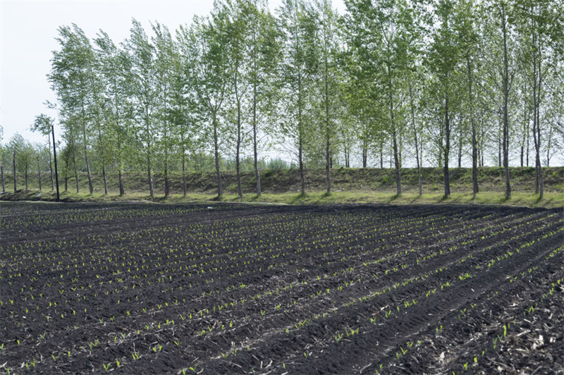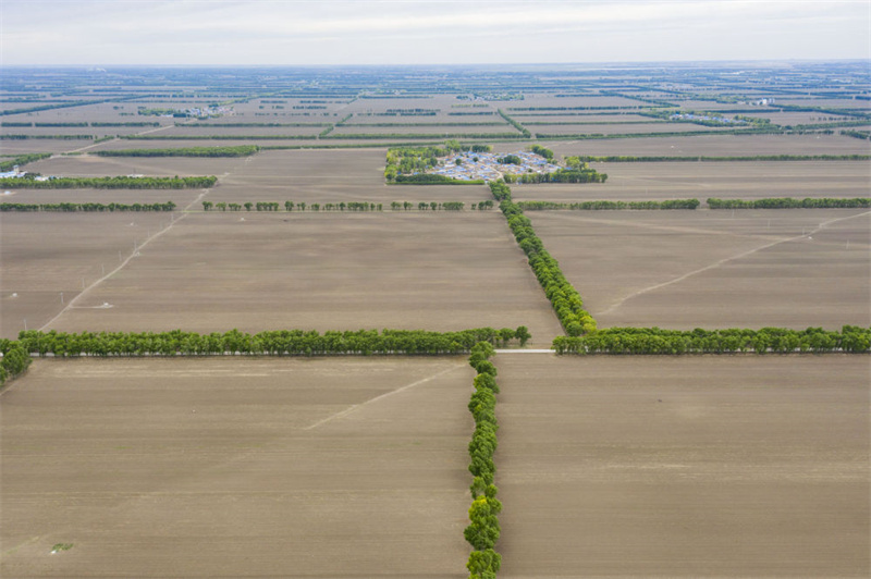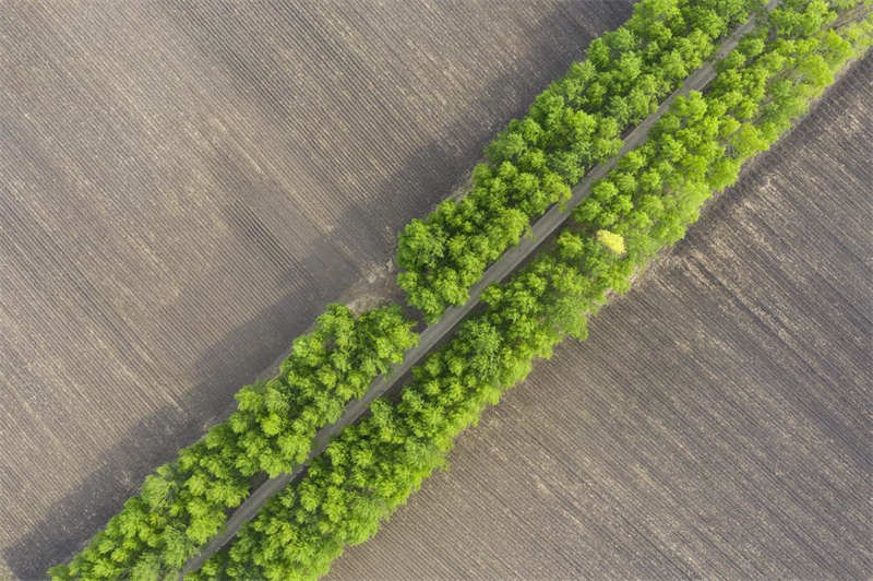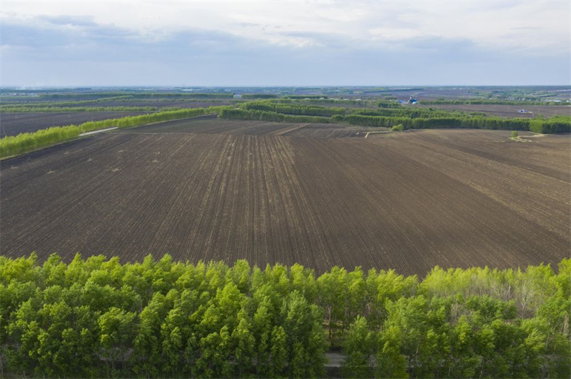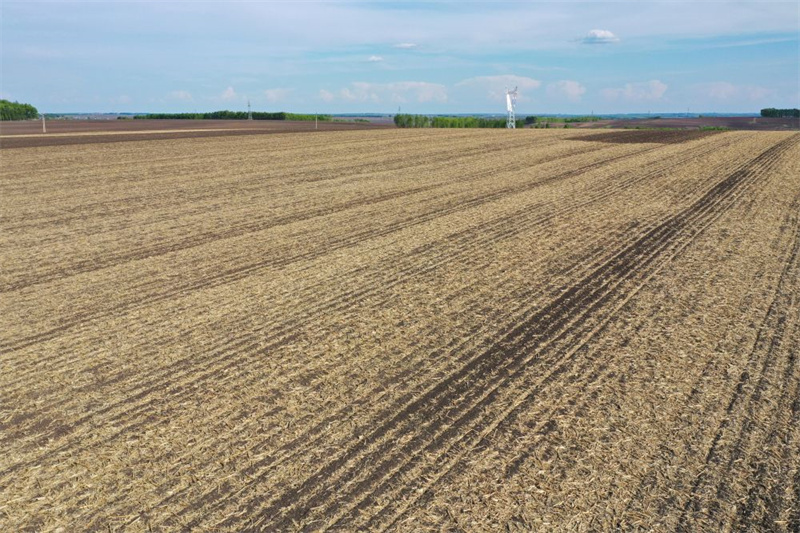 位于黑龍江省海倫市前進鎮(zhèn)光榮村的一片利用秸稈覆蓋免耕技術實施保護性耕作的黑土耕地(5月23日攝,無人機照片)。