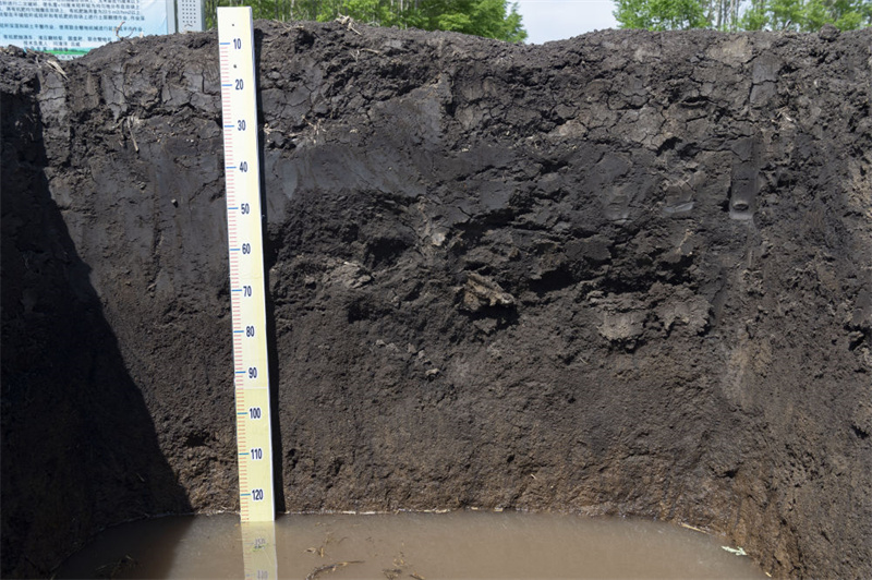 黑龍江省海倫市前進鎮(zhèn)自新村農(nóng)業(yè)科技示范基地內一處用來觀測黑土層厚度的土壤剖面(5月23日攝)。