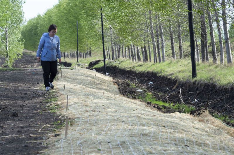 5月23日,在黑龍江省海倫市前進鎮(zhèn)光榮村,黑龍江省農(nóng)業(yè)科學院草業(yè)研究所副研究員劉杰淋在進行坡面生態(tài)修復的黑土坡耕地中查看治理情況。