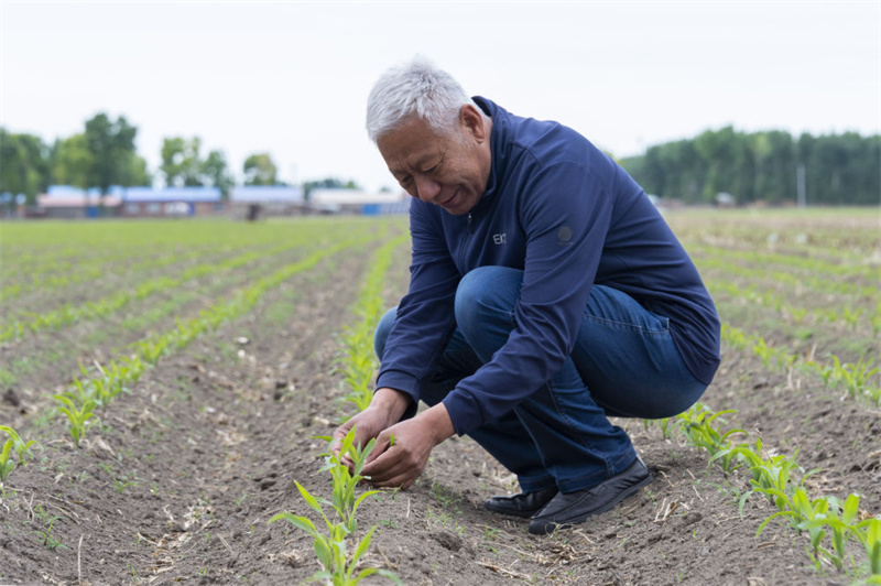 5月25日,在黑龍江省安達市羊草鎮(zhèn)安樂村,羊草鎮(zhèn)鄉(xiāng)村振興服務中心主任張寶慶查看玉米長勢。