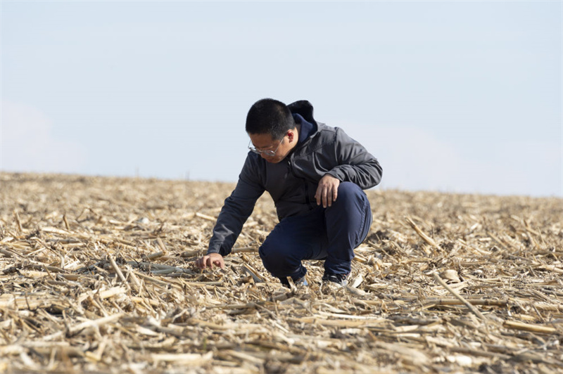 5月23日,在黑龍江省海倫市前進鎮(zhèn)光榮村,中國科學院東北地理與農(nóng)業(yè)生態(tài)研究所助理研究員李建業(yè)查看秸稈覆蓋免耕試驗地播種情況。