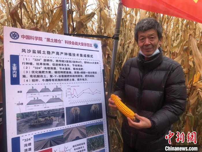 在吉林西部,中科院農(nóng)業(yè)專家展示采用新壟型耕作種出的玉米。 郭佳 攝
