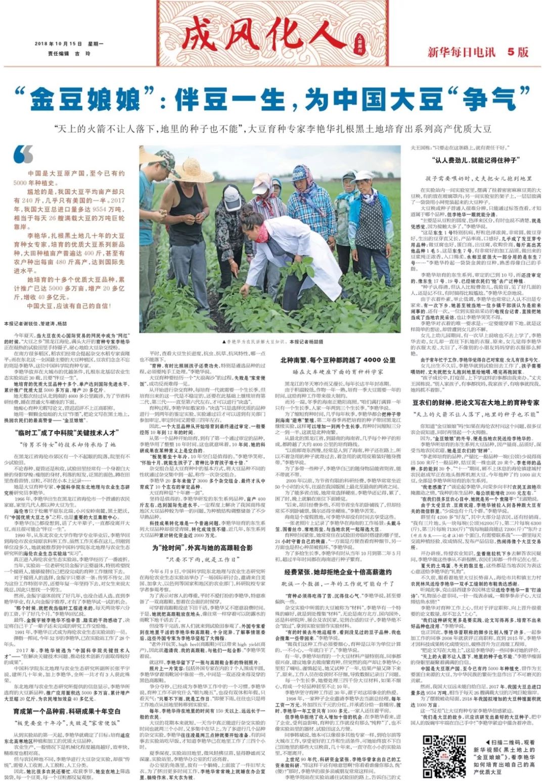 2018年10月15日,新華每日電訊和黑龍江分社聯(lián)合采寫的長篇報(bào)道《“金豆娘娘”:伴豆一生,為中國大豆“爭氣”》,報(bào)道“女袁隆平”李艷華數(shù)十年如一日、扎根黑土地育豆的感人事跡,因采訪深入,寫作精心,站位高又接地氣,這篇充分體現(xiàn)“四力”的報(bào)道推出后,立刻產(chǎn)生廣泛正面影響,讀者紛紛贊譽(yù),并呼吁振興國產(chǎn)大豆。