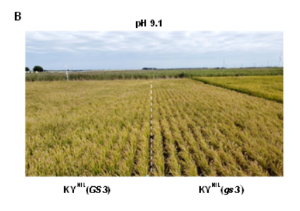 在重大理論突破基礎上,合作團隊對高粱進行耐鹽堿育種改良,在寧夏平羅鹽堿地(pH 9.10)進行的大田實驗表明,AT1基因的改造能夠使高粱籽粒增產(chǎn)20.1%,全株生物量(青貯用)增加近30.5%。研究人員進一步將AT1/GS3基因用于改良主要禾本科作物水稻、谷子和玉米等的耐鹽堿性,在吉林大安鹽堿地(pH 9.17)的實驗表明水稻年增產(chǎn)22.4-27.8%,在寧夏平羅鹽堿地(pH 9.10)的實驗表明谷子增產(chǎn)19.5%,同時發(fā)現(xiàn)該基因的修飾也能顯著增強玉米在鹽堿地的存活率。