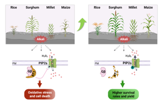 中科院遺傳發(fā)育所謝旗領銜的科研團隊與合作者獨辟蹊徑,首先通過全基因組大數(shù)據(jù)關聯(lián)分析耐鹽堿差異大的高粱資源,發(fā)現(xiàn)一個主效耐堿基因AT1,該基因與水稻的粒形調控基因GS3同源。同時,利用植物熒光探針系統(tǒng)發(fā)現(xiàn),在高鹽堿脅迫中,AT1通過調控水通道蛋白的磷酸化來調節(jié)在逆境情況下水通道蛋白的活性,并將逆境導致產(chǎn)生的ROS(活性氧物質)泵到細胞外降低氧化應激,首次揭示了作物耐鹽堿的分子機制。此外,研究人員還發(fā)現(xiàn)AT1的調控機制在主要糧食作物水稻、小麥、玉米及谷子中也保守存在。