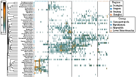 螺類(lèi)是軟體動(dòng)物腹足綱的通稱(chēng),日常食用的田螺、釘螺和花螺等食物都是螺類(lèi)的典型代表物種。螺類(lèi)種類(lèi)繁多,被描述的物種大約有八萬(wàn)到十萬(wàn)種,陸地水體已描述的物種大約有四千種。我國(guó)關(guān)于螺類(lèi)多樣性的研究大多數(shù)關(guān)于河流、湖泊和濱海濕地,對(duì)濕地螺類(lèi)研究關(guān)注較少。東北作為我國(guó)沼澤濕地最大的集中分布區(qū),其水生生物多樣性的地理分布格局及形成機(jī)制尚不明確。