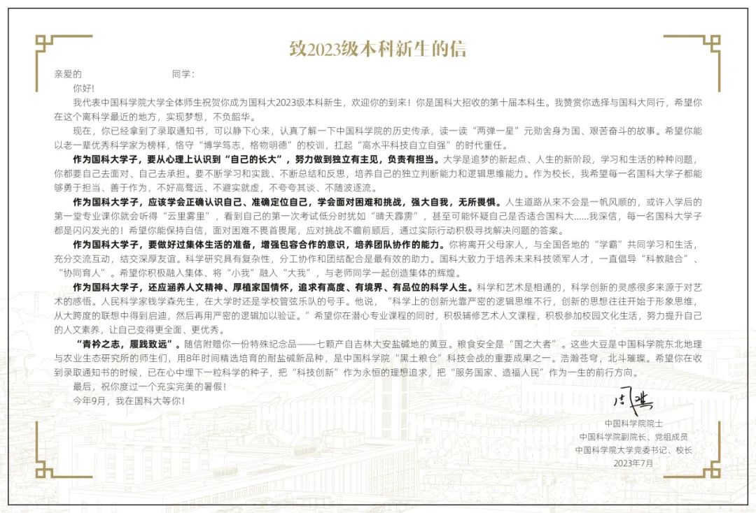 啟封國(guó)科大2023年本科生錄取通知書(shū)