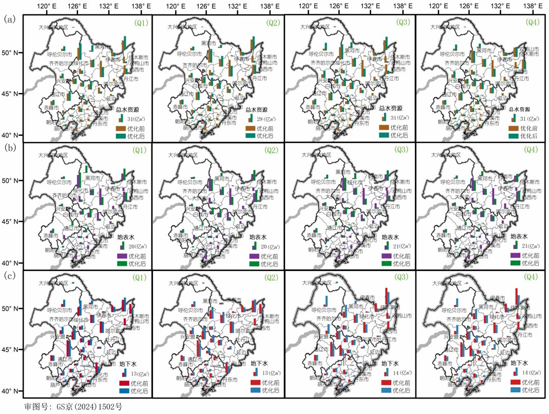 ▲優(yōu)化前后東北黑土區(qū)水資源開發(fā)利用對比分析(a)總水資源量(b)地表水資源量(c)地下水資源量(Q1:平水年常規(guī)灌溉,Q2:平水年節(jié)水灌溉,Q3:枯水年常規(guī)灌溉,Q4:枯水年節(jié)水灌溉)(圖片來源:中國科學(xué)院東北地理與農(nóng)業(yè)生態(tài)研究所)