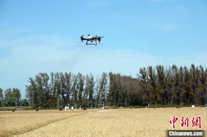 北大荒曙光農(nóng)場,項目團隊用大型無人機在示范農(nóng)田上空開展相關(guān)作業(yè)。中新網(wǎng)記者 孫自法 攝
