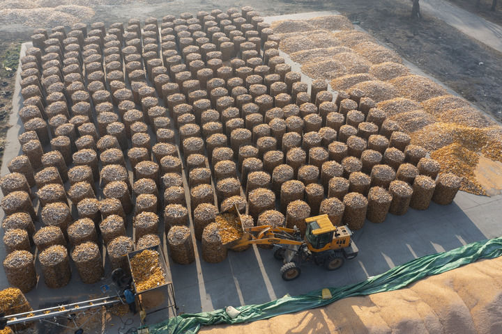 2024年11月13日,在黑龍江省肇東市一處秋糧晾曬場,海城雙麗現(xiàn)代農(nóng)機(jī)專業(yè)合作社的農(nóng)民駕駛農(nóng)機(jī)堆放玉米(無人機(jī)照片)。新華社記者 謝劍飛 攝