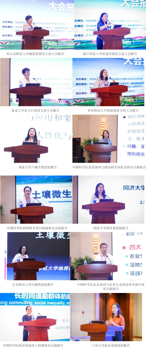 開幕式后的大會(huì)報(bào)告環(huán)節(jié)先后由哈爾濱師范大學(xué)臧淑英教授、浙江師范大學(xué)副校長(zhǎng)張建珍教授、延邊大學(xué)副校長(zhǎng)朱衛(wèi)紅教授、華東師范大學(xué)地理科學(xué)學(xué)院副院長(zhǎng)楊毅教授主持。香港大學(xué)地理系盧佩瑩教授,中國(guó)科學(xué)院南京地理與湖泊研究所陳雯研究員,中國(guó)科學(xué)院植物研究所副所長(zhǎng)馮曉娟研究員,同濟(jì)大學(xué)測(cè)繪與地理信息學(xué)院院長(zhǎng)謝歡教授,長(zhǎng)春師范大學(xué)副校長(zhǎng)、東北師范大學(xué)地理科學(xué)學(xué)院院長(zhǎng)白娥教授,中國(guó)科學(xué)院區(qū)域可持續(xù)發(fā)展分析與模擬重點(diǎn)實(shí)驗(yàn)室常務(wù)副主任、中國(guó)科學(xué)院地理科學(xué)與資源研究所王姣娥研究員,蘭州大學(xué)張東菊教授以“人性化的智慧城市與人工智能”“人文-經(jīng)濟(jì)地理學(xué)與區(qū)域規(guī)劃創(chuàng)新”“土壤礦物結(jié)合有機(jī)碳的穩(wěn)定性和調(diào)控因素”“地球與新型探測(cè)中的星載激光測(cè)繪技術(shù)”“土壤微生物驅(qū)動(dòng)的碳氮循環(huán)”“城市標(biāo)度律的新發(fā)現(xiàn):長(zhǎng)時(shí)間通勤群體的超線性增長(zhǎng)與社會(huì)不平等性”“丹尼索瓦人與青藏高原”為題作大會(huì)報(bào)告。中國(guó)科學(xué)院東北地理與農(nóng)業(yè)生態(tài)研究所副所長(zhǎng)李祿軍研究員向與會(huì)嘉賓介紹了中國(guó)科學(xué)院東北地理與農(nóng)業(yè)生態(tài)研究所的學(xué)科發(fā)展情況。