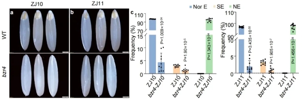 研究團隊發(fā)現(xiàn)了水稻無胚性狀的關(guān)鍵調(diào)控基因OsBZR4.在不同栽培品種中突變該基因,均可產(chǎn)生60%至100%的無胚種子。在這些無胚種子中,原本由胚占據(jù)的空腔被胚乳組織完全填充。