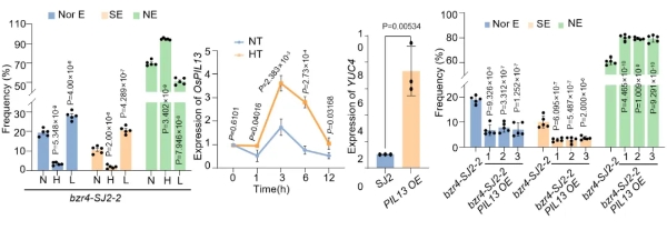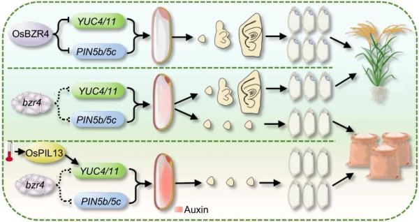 深入研究顯示,高溫能夠誘導(dǎo)植物光敏色素互作因子(PIF)家族基因OsPIL13的表達,而OsPIL13又能激活生長素合成基因YUC4的表達,從而加劇OsBZR4功能缺失突變體中生長素的過度積累,最終導(dǎo)致產(chǎn)生更高比例的無胚種子。