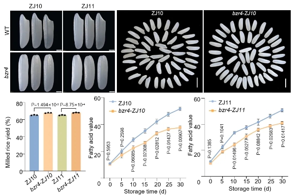 加速老化實驗表明,OsBZR4功能缺失突變體的貨架期比普通米延長了約一倍。這種“一石二鳥”的優(yōu)異特性,證明了OsBZR4基因在水稻育種中巨大的應(yīng)用潛力。