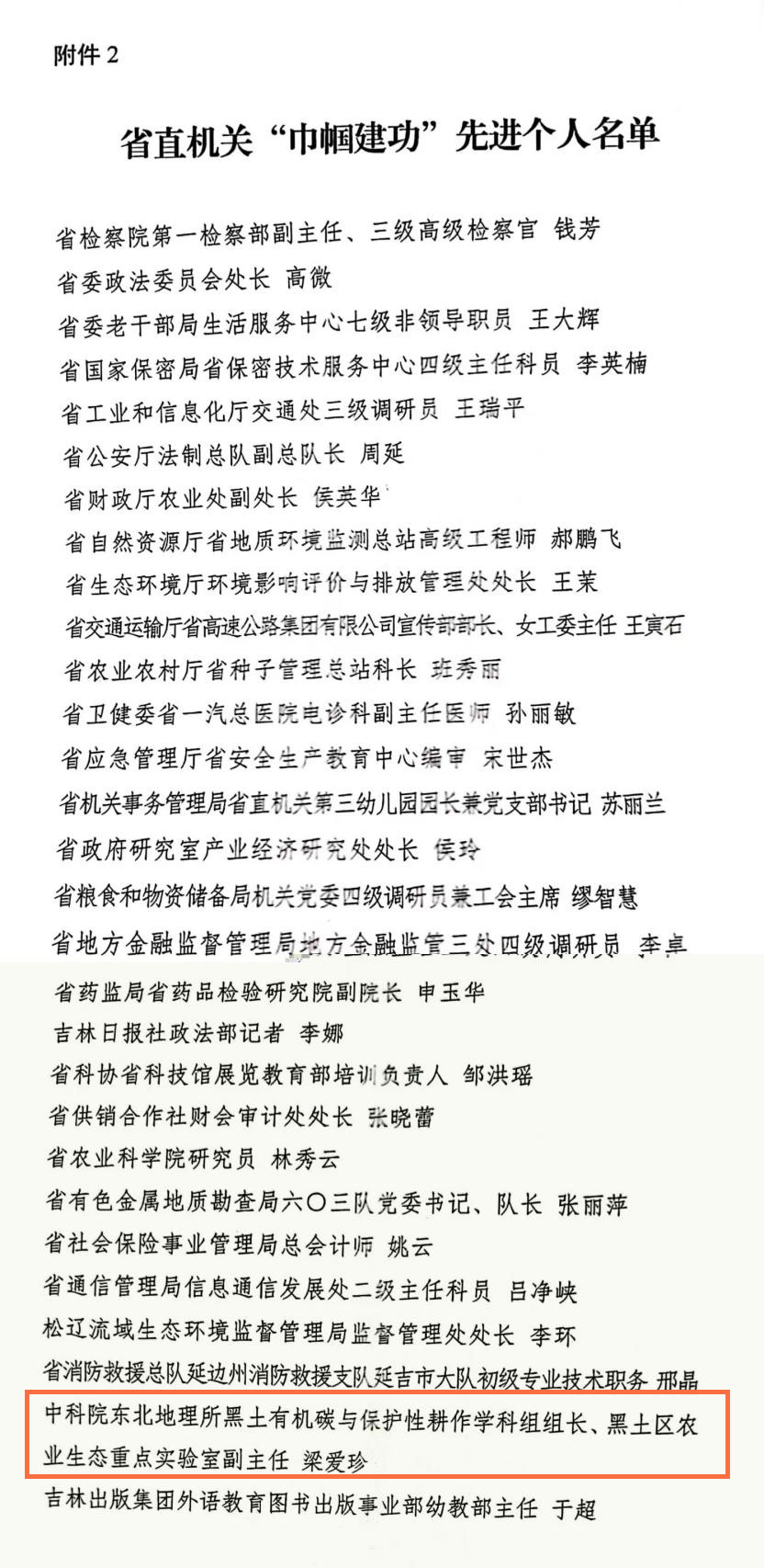 為表揚先進、培樹典型,省直機關(guān)婦工委印發(fā)《關(guān)于表揚2022年省直機關(guān)“巾幗建功”先進個人(集體)的通報》,對14個省直機關(guān)“巾幗建功”先進集體和29名省直機關(guān)“巾幗建功”先進個人給予通報表揚。東北地理與農(nóng)業(yè)生態(tài)研究所黑土有機碳與保護性耕作學(xué)科組組長、黑土區(qū)農(nóng)業(yè)生態(tài)重點實驗室副主任梁愛珍,榮獲2022年省直機關(guān)“巾幗建功”先進個人稱號。