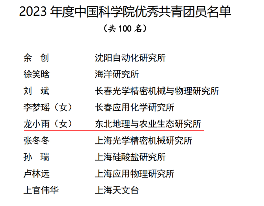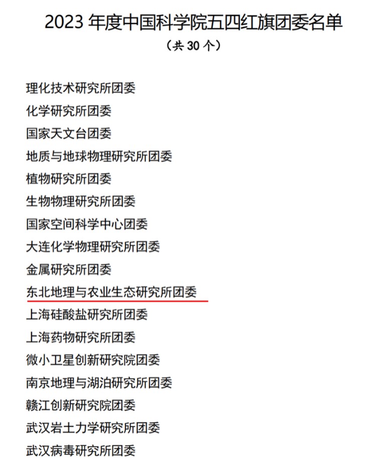 為表彰先進(jìn)、樹立典型,激勵(lì)團(tuán)青組織和廣大團(tuán)員、團(tuán)干部奮勇爭先、再創(chuàng)佳績。近日,中國科學(xué)院團(tuán)委發(fā)文對30個(gè)五四紅旗團(tuán)委、30個(gè)五四紅旗團(tuán)支部、50名優(yōu)秀共青團(tuán)干部、100名優(yōu)秀團(tuán)員青年進(jìn)行表彰。中國科學(xué)院東北地理與農(nóng)業(yè)生態(tài)研究所團(tuán)委榮獲“2023年度五四紅旗團(tuán)委”稱號、2023級博士研究生龍小雨榮獲“2023年度中國科學(xué)院優(yōu)秀共青團(tuán)員”稱號。