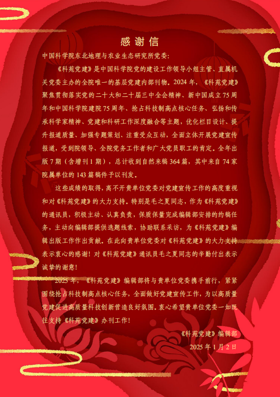 近日,東北地理所收到《科苑黨建》發(fā)來(lái)的感謝信,感謝所黨委對(duì)黨建宣傳工作的高度重視和對(duì)《科苑黨建》的大力支持,對(duì)《科苑黨建》通訊員的辛勤付出表示誠(chéng)摯的謝意!