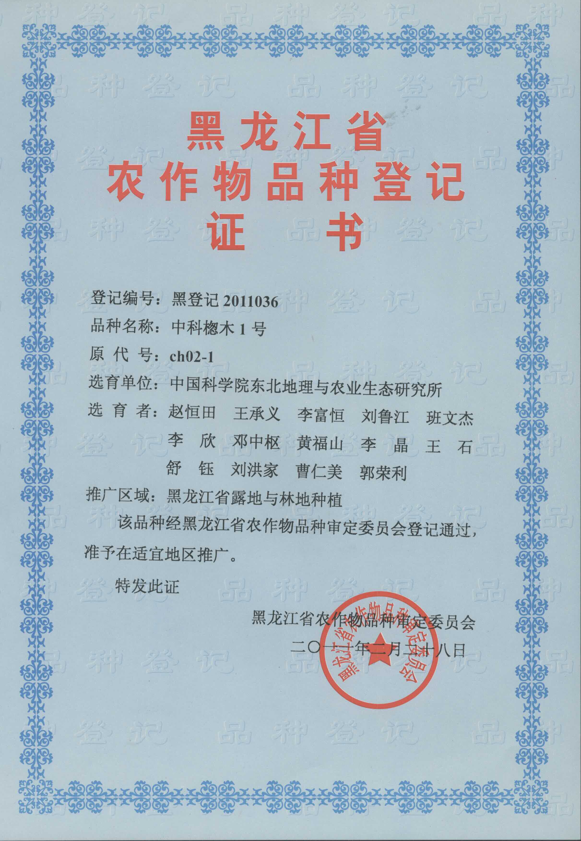 由我所趙恒田研究員課題組研制的“中科楤木1號”(登記編號:黑登記2011036)于2011年2月28日通過了“黑龍江省農作物品種審定委員”的新品種審定,準予在東北適宜地區(qū)推廣。