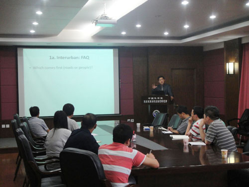6月29日,王法輝教授作了題為“Transport Networks and Human Settlement: A Sino-US Comparative Perspective”的學(xué)術(shù)報告。針對交通網(wǎng)絡(luò)與城市系統(tǒng)的作用關(guān)系,報告從將城市作為“點”和“面”的兩個層面展開,分別闡述了交通網(wǎng)絡(luò)對城市之間和城市內(nèi)部空間關(guān)系的影響。特別突出了復(fù)雜網(wǎng)絡(luò)分析和手機通信流量、基于GPS的出租車運行軌跡等新方法新數(shù)據(jù)的應(yīng)用。以中國鐵路與航空網(wǎng)絡(luò)、美國巴吞魯日、西班牙巴塞羅那以及中國青島、上海的相關(guān)研究成果為案例,王法輝教授詳細解釋了各類方法在交通網(wǎng)絡(luò)與城市系統(tǒng)研究中的運用,以及研究結(jié)論回答了哪些城市地理研究的基本科學(xué)問題,比如交通與城市興衰、城市內(nèi)部的最優(yōu)區(qū)位等。報告并從中美比較的角度,提出了未來研究方向。報告內(nèi)容引起了參會人員的熱烈討論,王法輝教授就大家提出的數(shù)據(jù)獲取、研究方法應(yīng)用如何選擇尺度、地理學(xué)科內(nèi)部交流合作等問題進行了詳細解答。