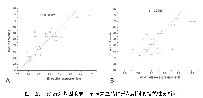 大豆分子育種重點實驗室在成功地完成了大豆生育期基因E1、E2、E3及E4基因克隆的基礎(chǔ)上,選擇了180個具有代表性的大豆品種,同時在全國主要大豆生態(tài)區(qū)的六個試點對大豆的開花期(R1)與成熟期(R7或R8)進行了表型觀察,對四個主要生育期基因進行了基因型鑒定,其中E1、E2、E3與E4基因的隱性基因型比率分別為38.34%、84.45%、36.33%和7.20%。將我國大豆品種劃分為8個基因型類型,e1-nf、e1-asE4、E1-asE3E4、e1-asE2(E3)E4、E1、E1E4(E3)、E1E3E4和E1E2E3E4,其中E1E3E4為優(yōu)勢基因型,占26.1%,e1-nf型(E1功能缺失型)開花最早,而E1E2E3E4 基因型開花最晚。并且在研究中發(fā)現(xiàn)不同品種中E1基因的表達量與大豆開花期呈極顯著相關(guān),說明大豆許多已知或未知的開花位點可能通過調(diào)控E1基因來控制開花的。本研究為進行深入研究大豆調(diào)控開花的基因網(wǎng)絡及開展分子育種提供重要基礎(chǔ)資料。