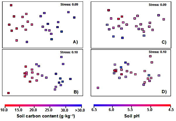 圖1 東北黑土農(nóng)田真菌群落結(jié)構(gòu)的NMDS分析。圖A和C及圖B和D是基于unweighted和weighted UniFrac群落分析結(jié)果