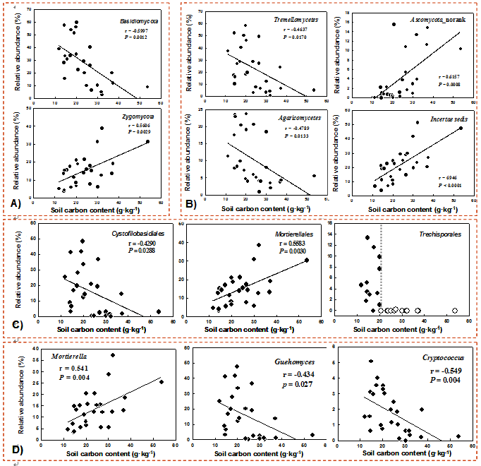 圖2 黑土農(nóng)田真菌在門(A)、綱(B)、目(C)和屬(D)上的相對(duì)豐度與土壤全碳含量間的關(guān)系