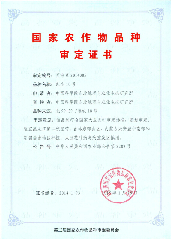 我所培育出的大豆品種“東生10號(hào)”獲得農(nóng)業(yè)部國(guó)家農(nóng)作物品種審委員會(huì)頒發(fā)的國(guó)家農(nóng)作物品種審定證書(shū),這是我所培育的大豆東生系列品種第四個(gè)獲得國(guó)家農(nóng)作物品種審定證書(shū),審定編號(hào):國(guó)審豆2014005。公告號(hào):中華人民共和國(guó)農(nóng)業(yè)部公告第2209號(hào),證書(shū)編號(hào):2014-1-93。