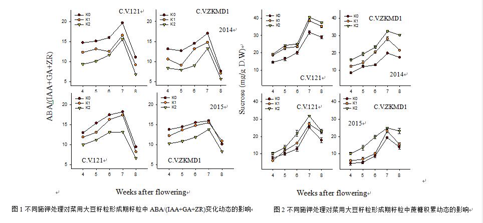 為此,在國家自然科學(xué)基金(41471241)和黑龍江省重點基金(ZD201307)的資助下,中國科學(xué)院東北地理與農(nóng)業(yè)生態(tài)研究所大豆分子育種學(xué)科組張秋英研究員、劉長鍇博士研究生及涂冰潔碩士研究生等從鉀素調(diào)控菜用大豆籽粒蔗糖代謝關(guān)鍵酶活性及植物內(nèi)源激素信號變化角度出發(fā),探究了不同施鉀處理條件下,菜用大豆籽粒中蔗糖代謝關(guān)鍵酶活性及內(nèi)源激素變化與籽粒蔗糖積累間的關(guān)系。研究發(fā)現(xiàn)施鉀后籽粒中蔗糖合成方向酶活性增強,分解方向酶活性變化較小,這對于維持庫器官中較高水平的蔗糖含量具有重要作用;同時,施鉀增加了菜用大豆籽粒中IAA、GA、ZR的含量,降低了ABA的含量,并且籽粒中ABA的含量與籽粒中蔗糖積累量呈極顯著負(fù)相關(guān),初次發(fā)現(xiàn)籽粒中ABA/(IAA+GA+ZR)的變化動態(tài)與籽粒中蔗糖變化動態(tài)一致(圖1,圖2),表明鉀素可通過影響內(nèi)源激素之間的平衡,進而促進籽粒中蔗糖的累積,該發(fā)現(xiàn)可為激素調(diào)控蔗糖積累方面研究提供新思路,對于合理施用鉀肥,改善菜用大豆食用品質(zhì)具有重要意義。