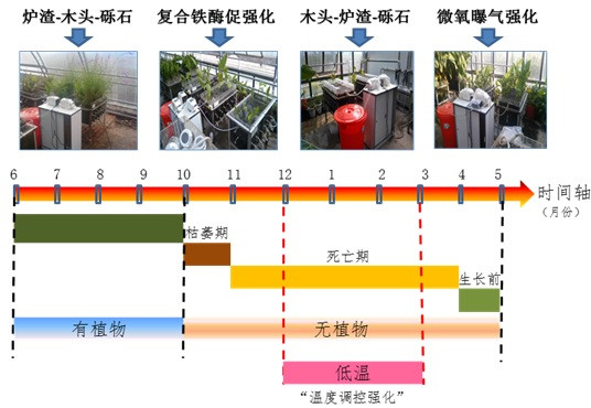 基于上述研究,水環(huán)境污染與防治學(xué)科組首次提出了以土壤/木頭芯片為核心,集硝化-反硝化、厭氧氨氧化于一體的新型人工濕地污染凈化體系,提出了四季運(yùn)行/應(yīng)用模式(圖 1),可為緩釋碳源型人工濕地技術(shù)的應(yīng)用和推廣提供重要科技支撐。