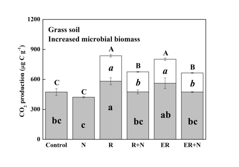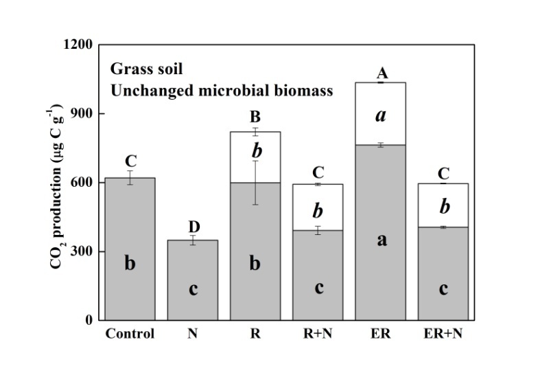 研究顯示,黑麥草添加顯著促進(jìn)了累積CO2排放,而氮素添加降低了其排放。培養(yǎng)結(jié)束時(shí)(42天),黑麥草中僅有9-16%的碳被礦化以CO2形式排放,其占到CO2總排放量的55%(農(nóng)田)和34%(草地)。氮素添加顯著抑制了黑麥草的分解(9-45%),而土壤微生物量大小的變化對黑麥草的分解沒有影響。整體而言,黑麥草添加對土壤有機(jī)碳的礦化造成了正激發(fā)效應(yīng),而黑麥草和氮同時(shí)添加則顯著降低了激發(fā)效應(yīng)。另外,微生物量大小的變化對激發(fā)效應(yīng)的影響因土壤而異。在農(nóng)田土壤中,激發(fā)效應(yīng)不受微生物量大小變化的影響。然而,在草地土壤中,微生物量大小與土壤氮素有效性對土壤有機(jī)碳礦化的激發(fā)效應(yīng)具有交互影響。因此,研究認(rèn)為,土壤微生物量的大小和土壤碳含量共同影響土壤碳礦化激發(fā)效應(yīng)的大小和方向,同時(shí)還受氮素有效性的影響。