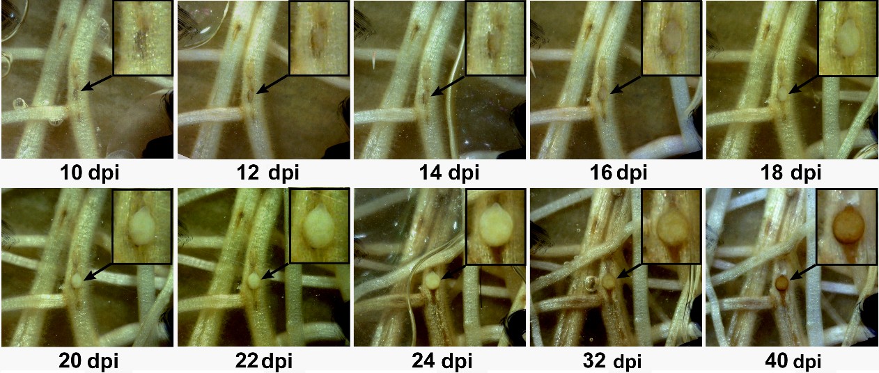 圖1 在幼苗生長(zhǎng)袋中直接觀(guān)察大豆孢囊線(xiàn)蟲(chóng)侵染大豆根部后的發(fā)育過(guò)程。(箭頭所指是同一個(gè)線(xiàn)蟲(chóng))
