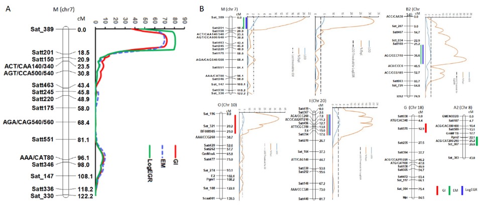 圖2.調(diào)控北方根結(jié)線(xiàn)蟲(chóng)(A)和南方根結(jié)線(xiàn)蟲(chóng)(B)的蟲(chóng)癭指數(shù)(GI)、卵塊數(shù)(EM)和卵數(shù)量(LogEGR)的大豆主效基因的分布及調(diào)控