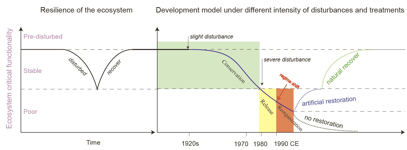 濕地生態(tài)系統(tǒng)相較于湖泊、河流生態(tài)系統(tǒng)等有著更強的彈性。對受損的濕地進(jìn)行恢復(fù),可以把該濕地“釋放”階段之前的生態(tài)特征作為濕地恢復(fù)的參考目標(biāo),之后濕地可通過自身的恢復(fù)力恢復(fù)到干擾前的狀態(tài),從而節(jié)約人工恢復(fù)成本和保持濕地恢復(fù)后的穩(wěn)定性。本研究得到國家自然科學(xué)基金(41571191; 41701217)和國家重點研發(fā)計劃(2016YFA0602301)的資助。相關(guān)研究成果發(fā)表在《Ecological Indicators》、《Science of the total Environment》上。