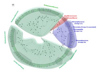 此外,針對(duì)古菌群落的研究?jī)H檢測(cè)到三個(gè)門,其中奇古菌(Thaumarchaeota)數(shù)量最多,其次是廣古菌(Euryarchaeota),而泉古菌(Crenarchaeota)占比非常小(圖2)。奇古菌中Thaumarchaeota group 1.1b是最主要分布類群,平均相對(duì)豐度為87.23%。鑒于Thaumarchaeota group 1.1b隸屬于Nitrososphaera類群,說(shuō)明黑土農(nóng)田土壤中的大部分古菌均參與了氨氧化過(guò)程。研究還發(fā)現(xiàn)古菌與細(xì)菌群落分布規(guī)律相似,均存在明顯的空間分布格局,土壤pH是驅(qū)動(dòng)古菌群落分布的最主要土壤因子。