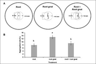 圖2 EPN對寄主韭蛆和寄主棲境韭菜根單獨及其互作的集聚反應(yīng)