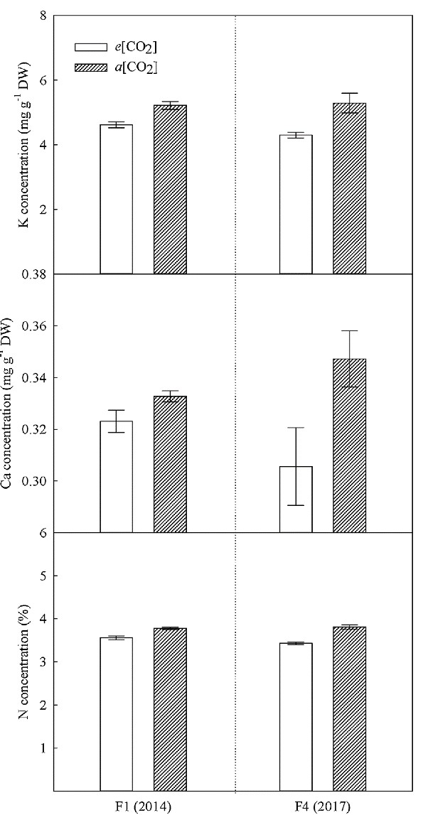 圖2 連續(xù)四代大氣CO2增高對小麥籽粒氮及礦質(zhì)營養(yǎng)含量的影響