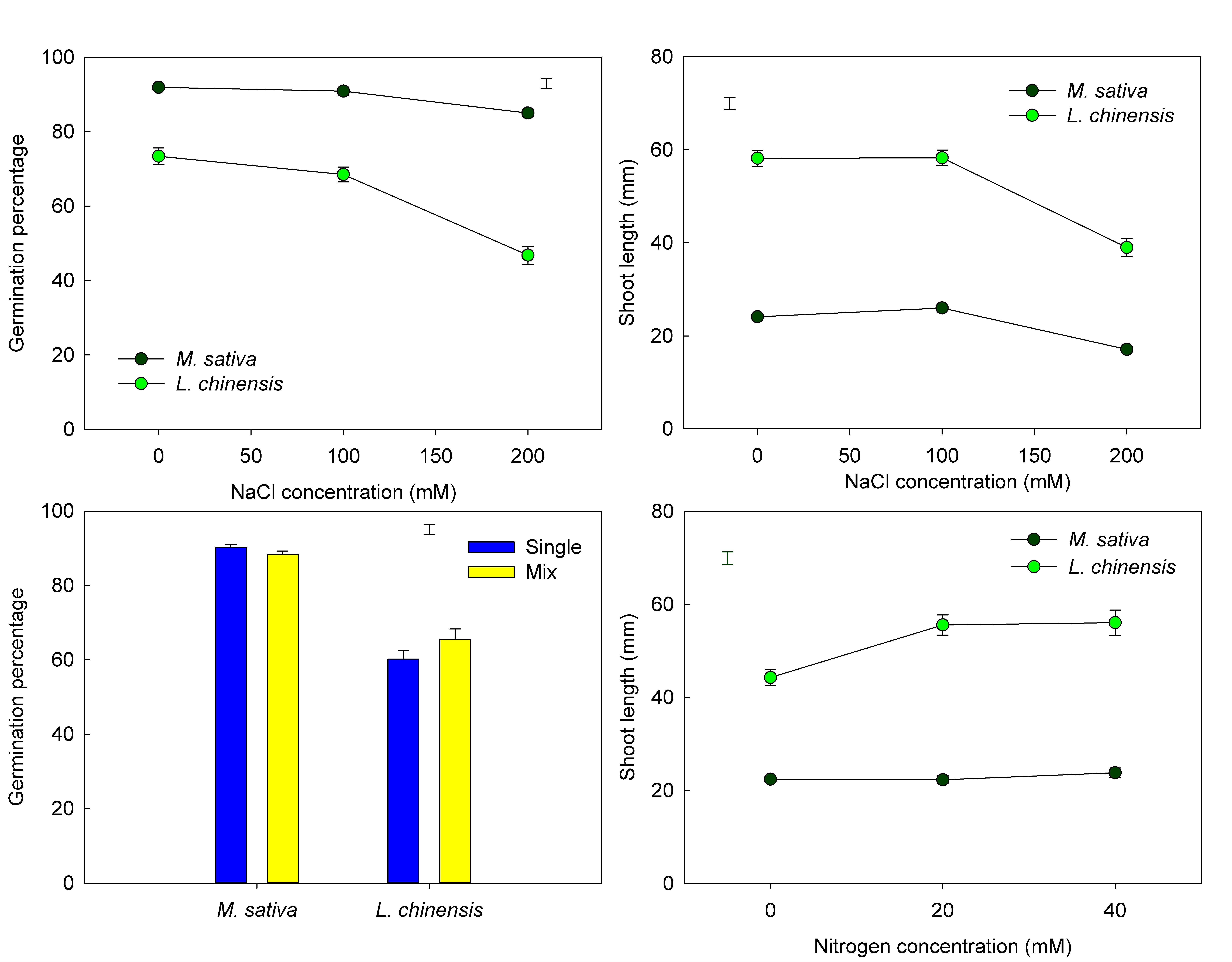為了研究鹽和氮的交互作用對(duì)優(yōu)質(zhì)牧草禾本科羊草(Leymus chinensis)和豆科紫花苜蓿(Medicago sativa)早期生長的影響,東北地理所草地農(nóng)牧業(yè)學(xué)科組科研人員開展了一個(gè)2×2×3×3析因設(shè)計(jì)實(shí)驗(yàn),兩種牧草在三個(gè)鹽濃度(0、100、200 mM NaCl)、三個(gè)氮濃度(0、20、40 mM NH4NO3)單播和混播條件下進(jìn)行萌發(fā)。研究結(jié)果表明,混播和氮添加顯著增加氮敏感物種羊草的發(fā)芽率、發(fā)芽速度和幼苗高度,而對(duì)固氮植物紫花苜蓿種子的萌發(fā)和幼苗生長影響不大(圖1)。苜蓿幼苗的鈉離子含量隨鹽濃度和氮濃度的增加而增加,氮含量保持相對(duì)穩(wěn)定;而羊草幼苗的鈉離字含量保持穩(wěn)定,氮含量在加氮條件下顯著增加。因此我們推測羊草和苜蓿混播條件下,苜蓿吸收鈉離子形成“微-生物治理micro-bioremediation”環(huán)境,使羊草吸收氮素作為養(yǎng)分和滲透調(diào)節(jié)劑,促進(jìn)其種子萌發(fā)和早期生長。