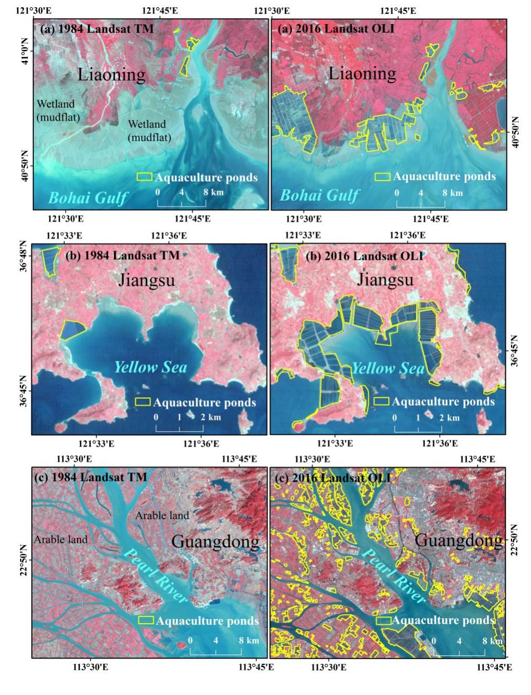 研究發(fā)現(xiàn),截止到2016年,中國濱海養(yǎng)殖池塘擴張面積達(dá)10,463 km2 ,約為80年代初期面積的4倍,其中,廣東、山東、江蘇是濱海養(yǎng)殖池塘擴張的熱點地區(qū)。近32年來,大部分沿海省市養(yǎng)殖池塘均呈持續(xù)增加的趨勢,1990-2000年間擴張最為劇烈,且主要發(fā)生在海岸線向陸一側(cè)的10公里緩沖帶范圍內(nèi)。養(yǎng)殖池塘擴張的主要土地覆被來源是濱海濕地(包括灘涂、紅樹林、蘆葦沼澤等)和耕地類型。政府導(dǎo)向的濱海土地開發(fā)政策、改革開放帶來的經(jīng)濟飛速發(fā)展等是造成濱海養(yǎng)殖池塘快速擴張的主要驅(qū)動因素,而濱海天然濕地?fù)p失、水質(zhì)惡化等則是養(yǎng)殖池塘擴張最直接和主要的環(huán)境影響。