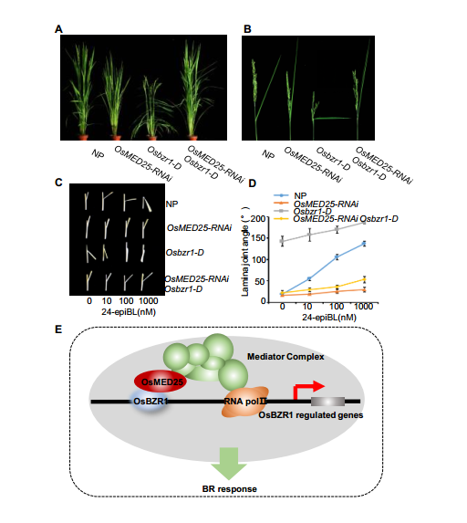 本研究發(fā)現(xiàn)在抽穗期OsMED25-RNAi和osmed25敲除突變體植株均呈現(xiàn)出葉夾角減小、株型緊湊的表型特征。BR敏感性實(shí)驗(yàn)表明,OsMED25-RNAi和osmed25敲除突變體植株對(duì)BR的敏感性顯著降低。說(shuō)明OsMED25能夠正調(diào)控水稻BR信號(hào)。