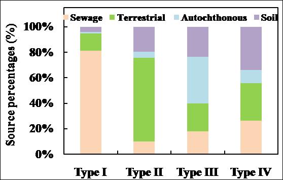 河流水體DOC的來(lái)源主要包括內(nèi)源和外源2個(gè)部分,土壤有機(jī)質(zhì)的侵蝕、陸生植物殘?bào)w以及人類生產(chǎn)、生活活動(dòng)排放的有機(jī)物等是外源有機(jī)碳的主要來(lái)源;而內(nèi)源DOC主要源于河流中植物葉綠體光合作用、細(xì)菌及其分泌物等。中國(guó)海河流域工農(nóng)業(yè)發(fā)展迅速,河流水體污染現(xiàn)象嚴(yán)重,中國(guó)科學(xué)院東北地理與農(nóng)業(yè)生態(tài)研究所水環(huán)境遙感學(xué)科組的科研人員對(duì)海河流域水體進(jìn)行了野外調(diào)查采樣,基于三維熒光技術(shù)和穩(wěn)定同位素分析技術(shù)解析了河流水體中DOC來(lái)源:1)受蒸發(fā)作用影響,海河流域河水中春季DOC濃度明顯高于秋季(p < 0.01),但春季DOC中陸源組分比例明顯低于秋季;2)海河流域河流水體中DOC主要來(lái)源于陸源物質(zhì),主要包括生活污水(9.8%-81.2%)和陸生植物殘?bào)w(13.3%-65.8%);3)按照海河流域河水中DOC的主要來(lái)源可將河水分為4個(gè)類型:I型河水,DOC主要來(lái)自生活污水(81.2%);II型河水,DOC主要來(lái)自陸生植物殘?bào)w(65.8%);III型河水,DOC主要來(lái)自土壤有機(jī)質(zhì)(36.4%);IV型河水,DOC主要來(lái)自浮游生物(33.9%)(圖1)。本研究結(jié)果進(jìn)一步掌握了河流水體中有機(jī)碳的組成、含量及來(lái)源等,有助于加深對(duì)河流水體有機(jī)碳循環(huán)生物地球化學(xué)過(guò)程的理解,為進(jìn)一步開(kāi)展河流水體有機(jī)碳循環(huán)研究工作奠定堅(jiān)實(shí)基礎(chǔ)。