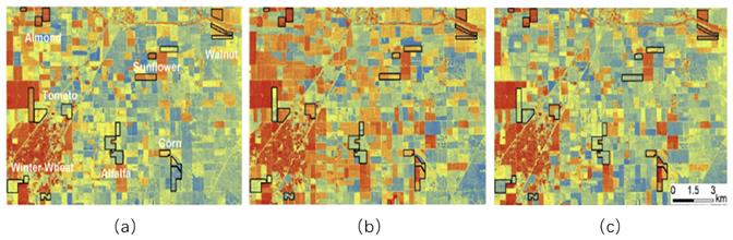 基于全極化UAVSAR數(shù)據(jù),研究人員計(jì)算得到全年Cloude–Pottier以及Freeman–Durden極化參數(shù),并利用極化參數(shù)及原始的雷達(dá)后向散射系數(shù)(HH,HV,VV)對(duì)農(nóng)作物全年生長(zhǎng)動(dòng)態(tài)進(jìn)行了監(jiān)測(cè)。研究結(jié)果表明,常綠作物(例如果樹)及飼料作物(例如苜蓿草)整個(gè)生長(zhǎng)季后向散射值十分穩(wěn)定,而冬小麥及夏季大田作物則變化劇烈,表現(xiàn)為從出芽階段到生物量峰值時(shí)段的快速上升,以及隨后到衰老階段的急速下降。整體上,6月和10月影像上極化信號(hào)異質(zhì)度很高,而7-8月份信號(hào)均質(zhì)度很高。