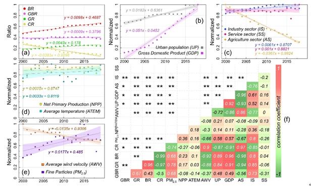 圖4. 土地動(dòng)態(tài)與社會(huì)經(jīng)濟(jì)生態(tài)指標(biāo)的相關(guān)關(guān)系