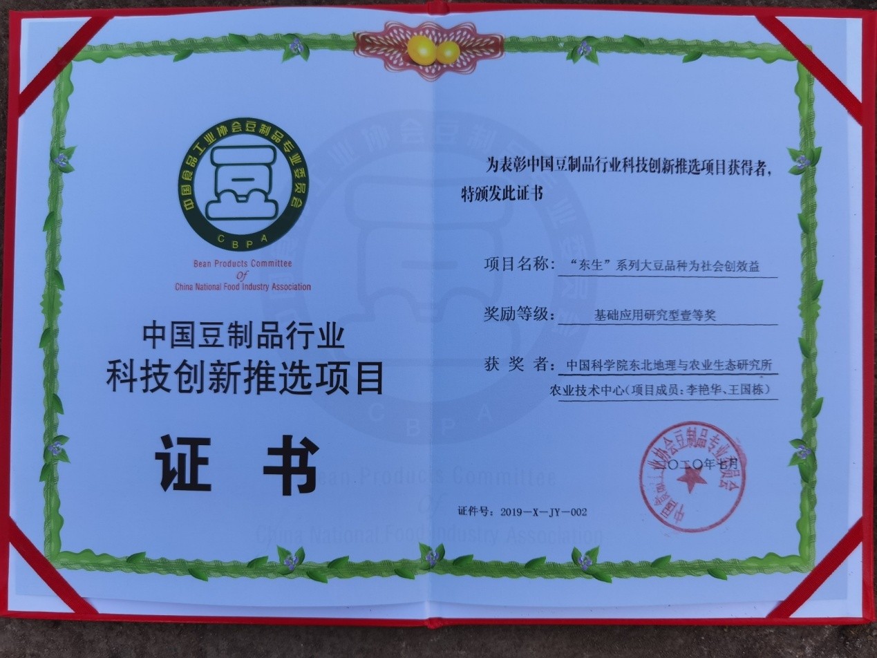 近日,2020年中國豆制品行業(yè)年會暨第七屆中國大豆食品專用原料研討會在安徽宿州召開,中國豆制品專業(yè)委員會揭曉了為中國豆制品行業(yè)發(fā)展作出突出貢獻的“2020年中國豆制品行業(yè)品牌企業(yè)50強”“中國豆制品行業(yè)科技創(chuàng)新推選項目及科技創(chuàng)新人才”名單。東北地理所寒區(qū)大豆育種學(xué)科組李艷華、王國棟的“‘東生’系列大豆為社會創(chuàng)效益”項目榮獲“基礎(chǔ)應(yīng)用研究型”項目一等獎。