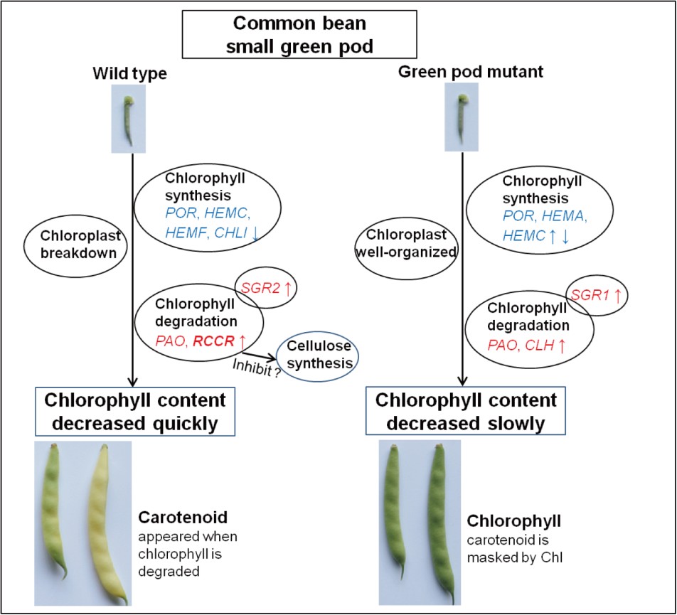野生型黃金勾的豆莢隨著生長(zhǎng)快速褪綠變黃,而在突變體庫(kù)中出現(xiàn)較高比例的綠色豆莢突變體,該突變體的豆莢顏色一直保持綠色。為研究黃金勾豆莢褪綠及類黃酮營(yíng)養(yǎng)成分的變化,對(duì)3個(gè)發(fā)育階段的豆莢進(jìn)行了轉(zhuǎn)錄組和代謝組測(cè)序。隨著豆莢的發(fā)育,葉綠素含量不斷降低,在野生型黃金勾中下降速率更快。對(duì)葉綠素代謝通路分析發(fā)現(xiàn),葉綠素降解基因紅色葉綠素降解產(chǎn)物還原酶(RCCR)在黃金勾綠色小豆莢中高表達(dá),而在綠色豆莢突變體中其表達(dá)量極低,推測(cè)該基因是黃金勾豆莢褪綠的關(guān)鍵基因。另一方面,綠色豆莢突變體豆莢質(zhì)地較硬,烹飪口感差,通過(guò)對(duì)纖維素含量進(jìn)行測(cè)定,發(fā)現(xiàn)綠色豆莢突變體中纖維素含量顯著高于野生型。且與野生型相比,綠色豆莢突變體中葉纖維素合成基因表達(dá)量上調(diào)。通過(guò)豆莢代謝組研究,共檢測(cè)到154種類黃酮物質(zhì),且隨著豆莢發(fā)育,多數(shù)類黃酮物質(zhì)含量降低。在黃金勾中,柚皮苷,牡荊素-2-O-鼠李糖苷,異槲皮甙,槲皮素,山奈酚,紫云英苷和芒柄花苷含量較高。而木犀草素,芹菜素,李屬異黃酮,鷹嘴豆素,黃顏木素在綠色豆莢突變體中含量較高。該研究從生理和分子水平揭示了黃金勾豆莢褪綠的機(jī)制,并對(duì)豆莢發(fā)育過(guò)程中類黃酮物質(zhì)進(jìn)行代謝分析,為解析營(yíng)養(yǎng)物質(zhì)變化提供理論基礎(chǔ)。