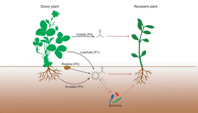 Figure 1 The different release pathways and effects of allelochemicals. The allelopathy plant (left) can release allelochemicals through four pathways (black arrows): leaching by rain (P1), decomposition of plant residues (P2), exudation from roots (P3) and volatilisation (P4). The allelochemicals can affect the test plant directly (red arrows) or indirectly through their effect on soil biota (dashed red arrows). Soil biota can also affect allelochemicals, such as through conversion or degradation of allelochemicals.